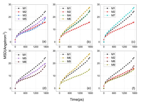 Figure 13a shows the comparison of MSD results for the M1, M2, M3, and M5 models which represent uncross-linked EPDM, the main chain cross-linking EPDM, main–side cross-linking EPDM at atom C3, and side chain cross-linking EPDM at atom C3, respectively. The order of slope from largest to smallest was: M1 > M5 > M3 > M2, which means that the cross-linking interaction between the main chain C2-C2 was stronger than the cross-linking interaction between the main chain and the C3 located at the side chain, while the cross-linking between the two C3 atoms sitting on two side chains was the weakest of them all.