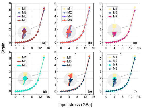 As shown in Figure 14, the strain in M1 was the largest under the input stress of 12 GPa among all the subplots because it was not cross-linked. The strains in the descending order after M1 were M3, M5, and M2 in Figure 14a, which reveals that the conformational entropy between the side chains (C3-C3) was lower than the cross-linking of the side and main chains (C2*-C3) in the type of cross-linking involving C3 atoms, while their conformational entropies were both stronger than the cross-linking between the main chains (C2*-C2*). This finding is also corroborated in the MSD results, where the slope of the MSD curve of the C2*-C2* were smaller than the other cross-links.