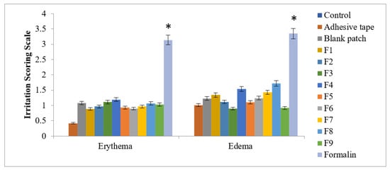 Skin irritation study: edema and erythema. Data are expressed as mean ± SD; n = 3. The results were significant compared to formalin (one-way ANOVA followed by post hoc Tukey test; p < 0.05).