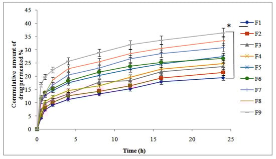 Permeation profiles of methotrexate from formulated patches (F1–F9). Data are expressed as mean ± SD; n = 3. One-way ANOVA followed by post hoc Tukey test (p < 0.05), F9 vs. F1.