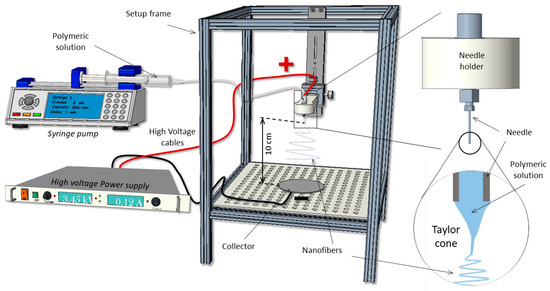 Nanofiber membranes were fabricated on an upright, home-made setup (Figure 1), using a controlled flow rate (0.5 mL/h) with a syringe pump (Chemyx Fusion 100, Stafford, TX, USA) which was connected to a blunt metallic 20 G needle through a capillary Teflon® tube. A high voltage DC power supply (FC Series 120 watt, CE Compliant) was used to provide the necessary electric field between the needle and the collector.