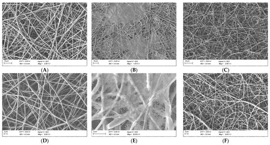 FE-SEM micrographs of electrospun scaffolds: (A,D) PCL 10%, (B,E) PCL 10% with gelatin coating, (C,F) PCL 20%: gelatin 8% (80:20). Scale bar: 10 μm (A–C); 2 μm (D–F).