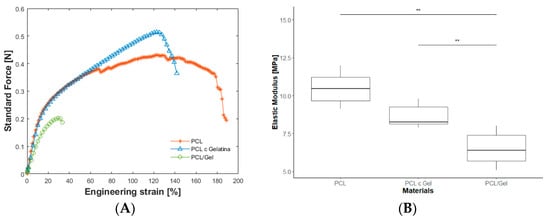 (A) Example of mechanical behavior of the scaffolds. (B) Boxplot of different materials showing the elastic modulus of PCL, PCL gelatin coating and PCL/gelatin 80:20 (** p < 0.05).