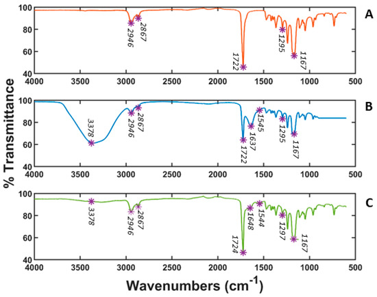 FT-IR of (A) PCL 10% scaffold (B) PCL 10% with gelatin coating and (C) PCL/gelatin 80:20 composite scaffold.