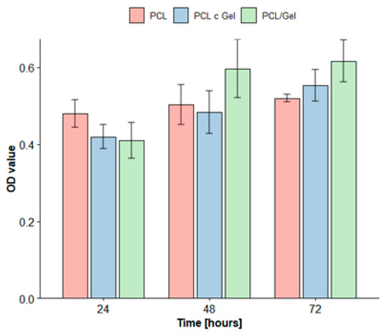 Figure 5 shows the proliferation of MEFs cultured on PCL, gelatin coated PCL, and blended electrospun PCL/gelatin mats for a duration of 24, 48 and 72 h. The OD values of all the considered mats increased, which implies that all of the tested mats exhibited good biocompatibility. PCL/gelatin scaffolds showed almost a 50% growth over the 3 days, in contrast to the 8% and 31% increase observed in PCL and gelatin coated PCL scaffolds, respectively. The presence of gelatin improved cellular proliferation across all of the tested scaffolds. In particular, the highest improvement of cellular proliferation (the most statistically significant improvement (p ≤ 0.05)) was observed for blended scaffolds, which achieved better proliferation than PCL or gelatin coated PCL scaffolds. This was because including gelatin within the blend distributed the natural polymer throughout the entire scaffold and positively impacted cell proliferation, especially when compared to scenarios where the presence of gelatin is limited to the scaffold surface (as occurs in coating procedures). Additionally, these results indicate that the PCL, gelatin coated PCL and PCL/gelatin scaffolds did not induce any cytotoxic effects in MEF cells.