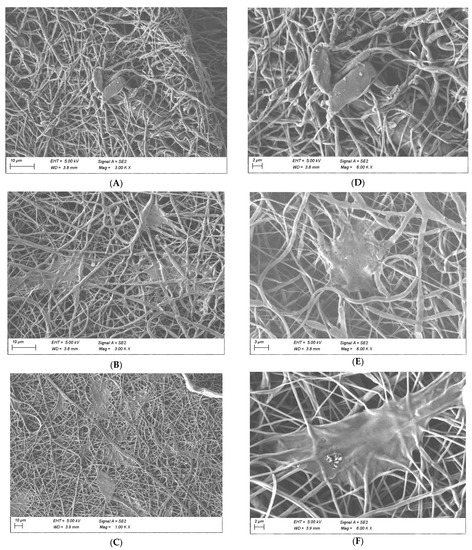 SEM images showing attachment of MEF on the surface of the scaffolds after 72 h: (A,D) PCL 10%, (B,E) PCL 10% with gelatin coating, (C,F) PCL 20%: gelatin 8% (80:20). Scale bar: 10 μm (A–C); 2 μm (D–F).