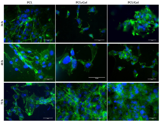 Figure 7 shows fluorescence images of the MEFs cultured for 24, 48, and 72 h on the three types of considered scaffolds. The number of MEFs increased from 24 to 72 h; the highest number of MEFs was observed on the blended PCL/gelatin samples. Overall, PCL based scaffolds exhibited good cellular organization after 72 h of culture.
