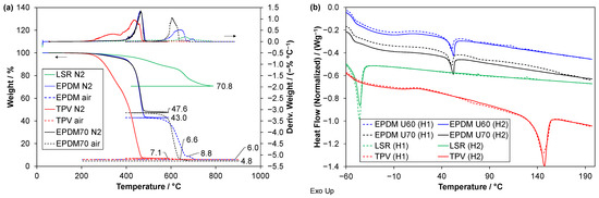 The thermal stability of the materials can be estimated from the temperature at which the weight is reduced to 95% (T95% in Table 4). The TPV is less thermally stable than the rubbers, while the LSR is more stable than the EPDMs. The DSC thermograms (Figure 2b) allow for identification of glass transition temperatures (Tg) and melting temperatures (Tm); see Table 4.