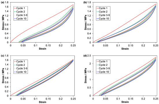 The effect of cycling on the loading-unloading loops can be described as a combination of a horizontal (strain) shift and a vertical shift. The vertical shift mainly affects the highest stresses. For the TPV and the EPDMs, the horizontal shifts are quite uniform for all strains, while they are non-uniform for the LSR. The TPV shows the strongest reduction in peak stress and the largest increase in residual strain upon cycling. For the LSR, the horizontal shift of the loading curves is nearly zero at low strains and the shift is largest for the unloading curves at intermediate to high strains (Figure 3b). If the loops of cycle 2–10 are arranged so that all have a common origin (i.e., a common starting point for the loading curves), it follows that the LSR shows a weak initial hardening upon cycling (see also derivatives for 2nd and 10th loading in Appendix C, Figure A3).