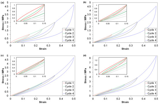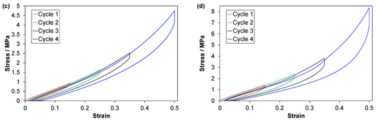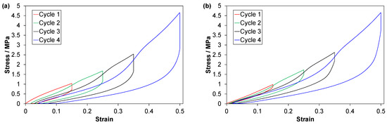 The data in Section 3.2. were obtained by a Python script which fitted the loading and unloading curves for all cycles individually with polynomial functions of order up to 7 (only the highest necessary order was used). To determine the start of loading curves and the end of unloading curves, via extrapolation to zero stress, only the lower part of the curves were fitted, and the order of the polynomial was reduced in order to avoid oscillations of the polynomials outside the fitting range affecting the extrapolations. The script also corrected all strains for a given test by a small horizontal shift, to correct for the pre-stress, resulting in a non-zero stress at zero strain for the first loading in the raw data. All fits were good (coefficient of determination (R2) always above 0.999, and in most cases above 0.9999). It can be noted that some of the unloading curves from the highest strain (50%) were better fitted by a stretched exponential function for the first part of the unloading (about 2/3) in combination with a quadratic function for the last part. However, such fitting functions were not used in this paper.