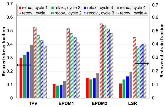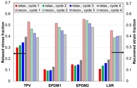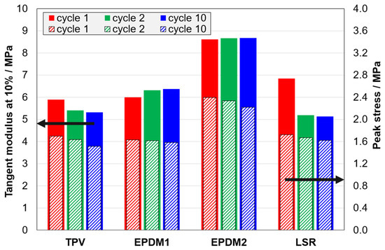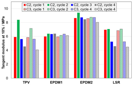 Furthermore, the TPV and the LSR show a large drop in modulus from the first to the fourth cycle, while the effect is insignificant for the EPDM materials. The stages with stress relaxation and strain recovery have no effect on the peak stress in a given cycle (not shown), but the relaxation has some effect on the loading curve shape. For the tangent modulus at 10%, there is an effect for the TPV (Figure 7 and Figure 8) and a slight effect for EPDM2, but there is no significant effect for the other two materials.