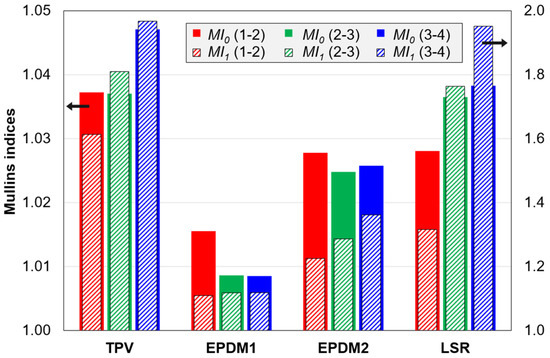 Values for MI0 and MI1 are shown in Figure 9. The main trend is that the TPV has the largest indices, followed by the LSR, EPDM2 and EPDM1. However, for the loading curve pairs 2–3 and 3–4, the difference between the TPV and the LSR is small. The two indices show slightly different trends. For the TPV and the LSR, MI1 is more sensitive to cycle number/strain amplitude than MI0, while the opposite is observed for EPDM1. For the EPDM materials, the two indices even show opposite trends from curve pair 1–2 to 2–3.