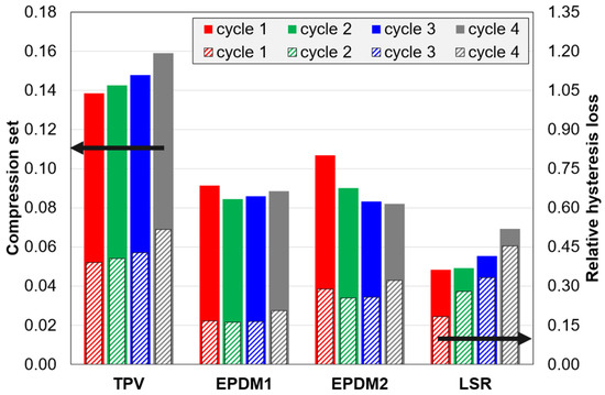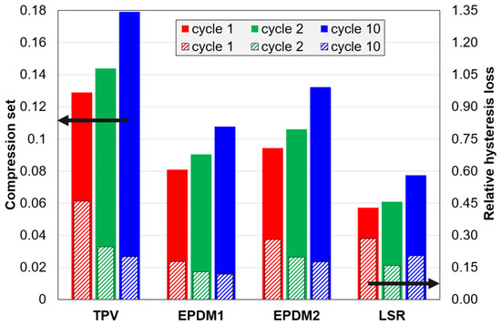 Values for the compression set immediately after unloading (CS defined in Table 3), for C1 tests, are shown in Figure 10. For all materials, the compression set increases with increasing cycle number. The TPV has the largest values, and the LSR has the lowest values. Figure 10 also shows relative hysteresis losses. Three of the materials show the expected trend; the hysteresis loss decreases with increasing cycle number. However, the LSR has a larger loss in cycle 10 than in cycle 2. This is due to the anomalous loading curves of this material; the loading curves for different cycles overlap in a certain strain range, while the unloading curves shift horizontally to larger strains with increasing cycle number, especially at intermediate and high strains; see Figure 3b.