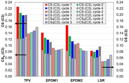 Figure 11 (for C2 tests) shows that there is some correlation between CS and HL for this dataset of four materials × four cycles. An explanation for this is that, graphically, a larger residual strain would directly increase the hysteresis loss as defined in Table 3. However, the Pearson correlation coefficient, r, for the entire dataset in Figure 11 is low (r = 0.59), but for the single materials the correlation is higher. If, e.g., the HL data for a given material are multiplied by a material parameter, and these four material parameters are optimized to maximize the correlation, this gives r = 0.980 (for the 4 × 4 dataset). Hence, this is equal to the average correlation coefficient for the four materials when considered separately. These four fitted material parameters characterize the materials relative to each other. (The values are (1.00, 1.04, 0.69 and 0.17) for TPV, EPDM1, EPDM2 and LSR, respectively. The value for the TPV was set to 1 as normalization.) Alternatively, the HL data for a given material can be multiplied by a weight factor equal to the average CS for the material, divided by the average HL for the material. This gives r = 0.956 for the 4 × 4 dataset. Note that the cycle trends for the TPV and the LSR contribute to high correlation, while the opposite is the case for the EPDMs.