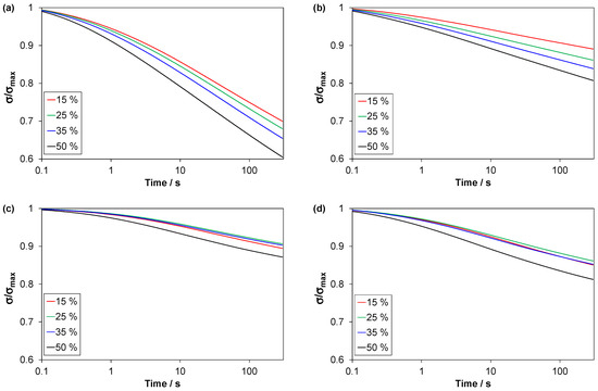Normalized stress relaxation; stress versus time for the 5 min relaxation stages in C3 tests. Strain amplitudes of the respective cycles are given in the legends. (a) TPV, (b) LSR, (c) EPDM1 and (d) EPDM2.
