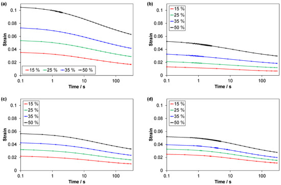 Stress vs. time in the 5 min stress relaxation stage of C3 tests. Time is set to t = 0 s at the beginning of the stage. (a) TPV, (b) LSR, (c) EPDM1 and (d) EPDM2.