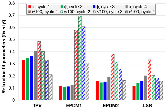 With the parameters Ai set to the average relaxed fraction for all cycles for a given material, i.e., one parameter for each material, and B being a fitted parameter, the correlation coefficient is r = 0.965. If the parameters Ai are fitted (one for each material), the correlation is improved further (r = 0.990), as shown in Figure A11. With fitted Ai parameters, the correlation is also high if B is set to zero (r = 0.947). However, this best fit gives Ai = 0 for EPDM1, but if Ai is set to 0.1 for EPDM1 (compared to 1 for the TPV), the correlation is still quite high (r = 0.943). On the other hand, if all parameters Ai are set to 1 in Equation (A2), the correlation reduces to r = 0.84 for the best fit.