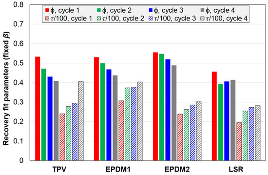 Finally the ratio of the CS values of the LSR and EPDM1 for C3 tests can be compared. For CS (instantly after unloading), this ratio increases monotonously vs. cycle number (strain amplitude) from 0.58 (for cycle 1) to 0.87 (for cycle 4), i.e., the difference between the LSR and EPDM1 decreases with increasing strain amplitude. For CSR the trend is the same, and the ratios increase monotonously from 0.77 to 0.93, i.e., the difference between the two materials is smaller after recovery. Finally, if strain recovery curves are fitted with a stretched exponential (Section 3.2.5), and the extrapolated strains in the limit t→∞ are used, the ratios are even higher, increasing monotonously from 0.81 to 0.97. Hence, for the highest strain amplitude in this study (0.5) and long recovery times, the difference between the two materials is very small.