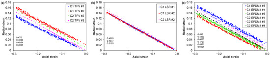 Stress-strain curves from C1 tests are shown in Figure 3. The TPV experienced a marked softening during the first loading, up to a strain of about 0.05 (Figure 3a). The derivatives (Appendix C, Figure A3) show a weak softening of the EPDMs, and a weak hardening of the LSR.