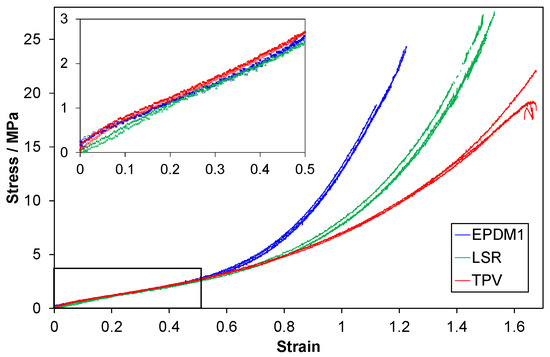 The cyclic stress-strain response of TPEs, EPDM rubbers and LSRs has been the topic of many studies, but few have studied them side by side. Refs. [22,23] compared TPVs with rubbers, but the materials had quite different hardnesses because the rubbers were also constituents in the respective TPVs.