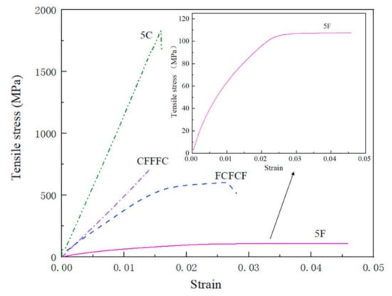 Tensile stress-strain curve of flax/carbon hybrid composite laminates (adapted with permission Elsevier, 2022) [].