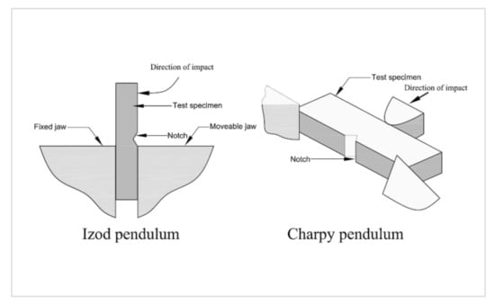 The charpy and izod impact tests, were classified as low velocity impact and were used to measure a material’s impact strength and toughness []. The approach calculates the amount of energy absorbed during fracture by a notched or unnotched sample of a material. Then there’s absorbed energy, which is a measure of a material’s toughness and may be used to research the ductile-brittle temperature transition []. Figure 3 depicts both the effects of Charpy and the izod tests. The difference between the two techniques lies in the manner of specimen support. For the Izod Impact Test, the specimen is placed vertically, whereas in the Charpy Impact Test, the sample is placed horizontally on the specimen holder.