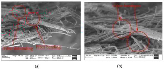 SEM images of fracture surface morphology of plain flax composites failed under impact loading at different magnifications (a) fibre debonding and bending; (b) fibre breakage reproduced from [] MDPI, 2019.