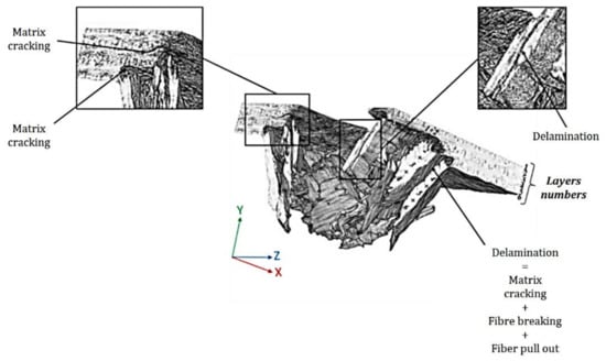 Micro CT scan image of a flax composite specimen (3/4 of the impact hole) after an impact test, with a 50 J impact energy, showing different failure modes in the specimen reproduced from [] MDPI, 2020.
