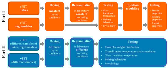 However, a widespread opinion in industry is that a distinction between rPET and vPET can be made indirectly by testing the material properties of the rPET and comparing them with the properties of vPET. However, there is no scientific study investigating this approach. In order to fill this information gap and eradicate this misunderstanding, a comprehensive study on the evaluation of rPET and vPET properties has to be performed. Even if a change in molecular structures or material properties can be observed due to repeated thermomechanical stress occurring during mechanical recycling, this approach is still incorrect, since there are various further causes resulting in the same effect such as insufficient pre-drying or stabilization as well as the use of unfavorable processing parameters.