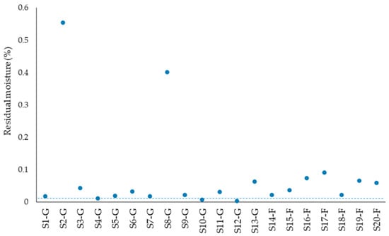 Residual moisture of rPET samples. The dotted line specifies literature value for the residual moisture.