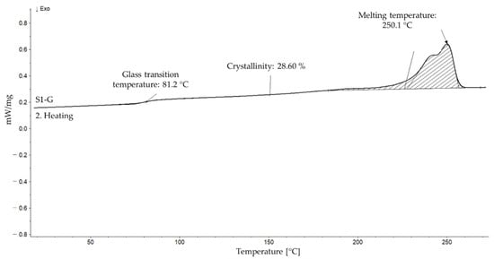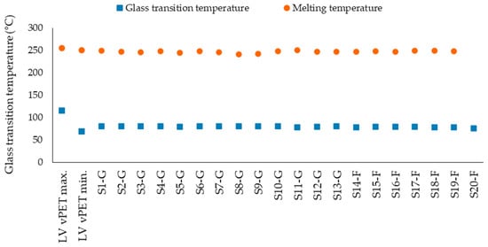 The DSC results of the tested samples and their comparison with the literature values are shown in the Figure 4. Comparison of the values shows that the rPET samples reach their melting point on average at about 243 °C. The lowest melting temperature is 241.1 °C (S8-G) and the highest 250.1 °C (S1-G). This is comparable with the literature values for vPET in the range of 250–255 °C [36]. Similar results are observed in the case of glass transition temperature. The values for rPET are between the minimum and maximum Tg values of the vPET, which are 69–115 °C [12]. The behavior of the Tg shows a very slight difference when commercial regranulates are compared with flakes; namely, the Tg is reached slightly earlier by the regranulated flake samples and lies in the range of 78.3–80.1 °C, while the Tg of the commercial regranulates is between 79.1–81.2 °C. There are different factors affecting Tg of polymers, such as molecular structure and weight distribution, polar groups or cross-linking degree. Among these factors, mainly molar mass is relevant for this study. An increase in molar mass leads to a decrease in polymer chain end concentration, leading to the reduction of their free volume and increase in Tg. Consequently, the regranulated flakes have probably lower molar mass than industrial regranulates. This behavior can be a result of higher moisture content. Therefore, pre-drying seems to have a higher impact on Tg than whether it is a vPET or rPET.