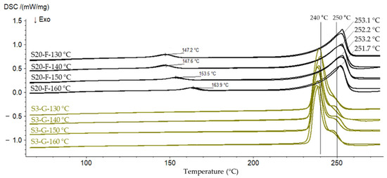 Melting curves of commercially granulated rPET (S3-G) and laboratory granulated rPET flakes (S20-F) dried at different temperatures from 130–160 °C.