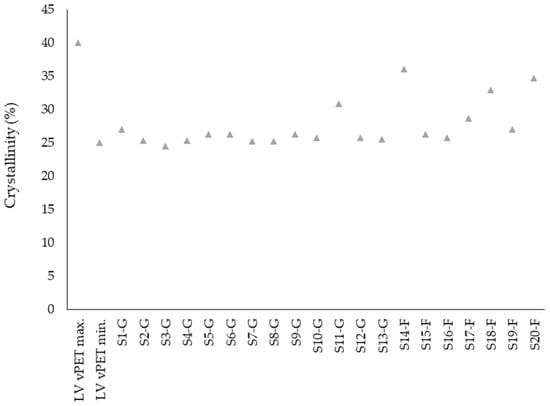 The material properties of a polymer such as transparency, density, ductility or strength are among further factors dependent on crystallinity of a given polymer. The DSC is one of the principal methods used to determine the crystallinity of a sample. The crystallinity of the tested samples is represented in Figure 6. The observed rPET results are comparable with the literature values of 29.7–32.9% for rPET [41]. Although the values for rPET are in line with those of vPET, in general they are closer to the minimal value of 25%. Regranulated flakes show a slightly higher crystallinity degree than the commercial regranulates, which is possibly also a result of the residual moisture content.