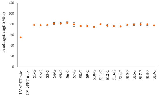 Experimentally determined bending strength of rPET samples in comparison with literature values for vPET.