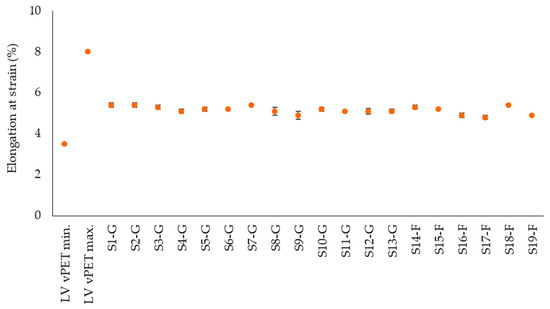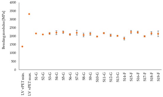 Figure 7, Figure 8 and Figure 9 represent bending strength, bending modulus and elongation at strain of the tested samples. Despite different moisture contents, the bending properties of the rPET are comparable with the literature values of vPET [42]. The bending strength of the flakes and regranulates is also similar (Figure 7). The flexural modulus values of the rPET samples are also comparable within the group but generally tend to be in the lower range of the literature values of vPET (Figure 8). The lower bending modulus means that the rPET samples are more flexible than vPET. The lowest modulus value of S14-F is 1860 MPa, which correlates with the highest crystallinity of 36.1% in Figure 6. However, the lowest crystallinity of 24.5% (S3-G) results in a modulus of 2162 MPa, which is not the highest value. This shows that further factors besides crystallinity need to be considered for an accurate evaluation of the results, such as molar mass or the presence of PET degradation products in the samples. The bending strain shows an average value at 5.2% (Figure 9). The lowest elongation of the commercial regranulates is 4.9% and of the granulated flake samples it is 4.8%, while the elongation of vPET ranges from 3.5–8%.