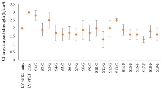 Based on the assumption that both crystallinity and molar mass influence toughness of a plastic, a higher crystallinity leads to a higher strength since intermolecular bonding is more significant in the crystalline phase. Sample S14-G has the highest crystallinity of 36.1% and an impact strength of only 1.89 kJ/m2. Similarly, the crystallinity of sample S11-G is 30.9% and impact strength 1.3 kJ/m2. The recognizably high error bars in Figure 10 can be explained by the reduction of the molar mass, since PET chains have suffered cracks during reprocessing PET [21,43]. Moreover, the heterogeneity of the polymer chains during the recycling process and presence of impurities promote this behavior [12]. Consequently, the simultaneous influence of molar weight distribution as well as presence of cleavage products on mechanical properties of at least three different samples of recycled and virgin treated under the same conditions should be investigated in the second part of this study.