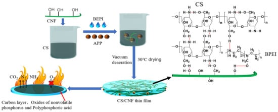 The mechanical strength of CS-based films is often reduced by the addition of some functional particles and the flame retardant performance also still need to be improved. In this study, in order to produce a CS-based film with good mechanical strength and flame retardancy, CNF was used as the reinforcement material to improve the mechanical properties of CS films; both APP and BPEI were used to enhance the flame retardant performance of CS-based films. The resulting CS/CNF/APP/BPEI composite film was prepared by simple drying. In view of the excellent properties and simple preparation process, the resulting composite film has good prospects for potential application.