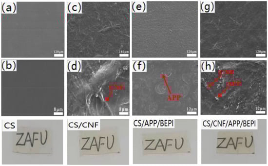 As shown in Figure 2a,b, CS showed good film-forming property, and the pure CS film was smooth and dense due to the strong hydroxyl bonds formed inside and among the CS molecular chains. After the introduction of CNF, the surface of the CS/CNF composite film showed many irregular filamentous bulges due to the partial exposure of CNFs with high length–diameter ratio on the film surface (Figure 2c,d). When only adding both APP and BPEI (Figure 2e,f), there was no obvious phase separation in the composite film, indicating that CS has good compatibility with PEI. However, some small holes appeared on the film surface; this might be caused by bubbles bursting during drying. After the CNF, APP and BPEI were added (Figure 2g,h), the exposures of the CNFs and APP were more obvious. The additional amounts of CNF, APP and BPEI was very small and their distribution was relatively uniform, so the transparency of the CS-based composite films was very good and the covered substrate can be clearly seen in the illustrations of Figure 2.
