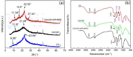 As shown in Figure 3a, in the pure CS film, the main diffraction peaks are at 9.26° and 22.66°. This is consistent with the previous report [33] where the crystalline forms of CS appear 2θ = about 10° (marked as Form I) and 20° (marked as Form II), respectively. The crystallinity of the CS film as given by the MDI-JADE XRD spectrum analysis software was 22.97%. In the CS/CNF film, the main diffraction peaks were located at 11.8° and 21.48°; the position of the peaks produced a little deviation and the crystallinity of the CS/CNF composite film was reduced to 12.34%. This may be because the hydrogen bonding between CS molecules and CNF disturbs the original crystallization of CS. However, the two peaks of the CS/CNF film widened, which may be due to the superposition of the diffraction peaks of CS and CNF [34]. When both APP and BPEI were added to the CS/CNF system, the characteristic peaks of APP showed at 14.9°and 27.34° [35]. The main diffraction peaks of CS were located at 11.34° and 22.52°, and only had a weaker change compared with that of the CS film, and the crystallinity of the CS/CNF/ APP/BPEI composite film increased to 23.88%. This was because APP could play a role in blocking CS and CNF off from direct contact to some extent and affect the forming of the hydrogen bonds between CS and CNF, weakening the influence of CNF on the crystal structure of the CS film.