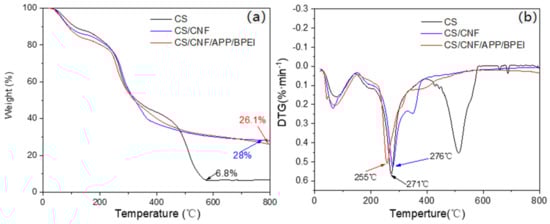 The thermal stability is one of the important indicators of fire retardant properties. Figure 4a showed a change in the CS-based composite films from 25 to 800 °C. The decrease in the mass of all the CS-based composite films below 100 °C was caused by a large amount of evaporation of water. The decomposition and carbonization of CS at around 171~571 °C resulted in a rapid decrease in the mass of the pure CS film, and it exhibited stability after 571 °C because the remaining carbon would not significantly reduce with the change in temperature [39] and the residue was only 6.8% (Table 1). The mass of the CS/CNF composite film decreased from 172 to 377 °C due to the decomposition and carbonization of both CS and CNF. When the temperature reached 400 °C, the CS/CNF composite film tended to be stable in mass. This might be because after the thermal decomposition, the CS formed a carbon layer covering the surface of CNF, which had a certain protective effect. Consequently, the remaining weight of the CS/CNF film was higher [40]. The fastest decomposition rate of the CS-based composite films showed no discernible difference before and after the addition of CNF due to the similar properties of CS and CNF, occurring at 271 °C and 276 °C, respectively (Figure 4b). In the CS/CNF/APP/BPEI composite film, CS, APP and BPEI decomposed with the increase in temperature and produced a loose carbon layer on the CNF surface. Therefore, the TG curve was similar to the CS/CNF one, but showed the lowest temperature (255 °C) of the fastest decomposition rate due to the thermal decomposition of APP and BPEI. After 600 °C, the CS/CNF and CS/CNF/APP/BPEI composite films had higher residual mass (28% and 26.1%, respectively) than that of the pure one, suggesting the addition of CNF, APP and BPEI was beneficial to the thermal stability of the CS-based composite film [25].