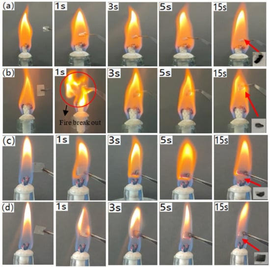 In the flame burning test, the samples, with a weight of about 10 mg, were moved into a flame from an alcohol lamp and not moved out until 15 s of burning was observed [41]. Figure 5 shows the macroscopic morphologies of the CS-based composite films during the process of the combustion test. The pure CS film curled up when entering the flame from the alcohol lamp and there was a small amount of burning residue left after 15 s (Figure 5a). After the addition of CNF, flame was observed to break out (Figure 5b), which might cause certain harm in the practical application, but not in the CS/APP/BPEI composite film (Figure 5c). This was caused by the combustion of CNF on the composite film surface. When CNF, APP and BPEI were added, no flame was observed (Figure 5d). This was because the CNF was covered by BPEI and APP and became unburnable.
