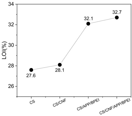 The LOI value is one of the key indicators of flame-retardant materials; when its LOI value is not less than 21%, it is called a flame-retardant material [42]. The samples were ignited in an LOI meter, the ignition source was immediately removed, and their burning was observed. The results (Figure 6) showed that the LOI value of the pure CS film was 27.6%. CS itself had a certain flame retardant property due to its high carbon content and a portion of n, as well as some nonflammable gases and carbon layers that were formed during heating, which helped prevent further combustion. The LOI value of the CS/CNF film was 28.1% and showed no significant difference compared to the pure CS film, which might be due to the low additional amount of CNF. After the addition of both APP and BPEI, the flame retardant performance of the CS/APP/BPEI and CS/CNF/APP/BPEI composite films had been greatly improved and their LOI values were up to 32.1% and 32.7%, respectively. This was because APP and BPEI increased the N and P elements of the system, and BPEI could stimulate the decomposition of APP, releasing CO2, N2, NH3, etc., and forming a protective phosphating layer to block the entry of O2.