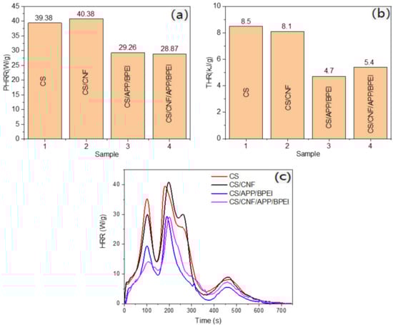 To further verify the flame retardant properties, the MCC analysis was conducted. As shown in Figure 7a–c, it could be seen that both before and after adding only CNF, the heat release rate (HRR), the peak heat release rate (PHRR) and the total heat release rate (THR) all showed no discernible difference due to the low additional amount of CNF. Additionally, the CS-based films showed the strong peaks at about 210 °C, and the corresponding PHRR reached 39.38 W/g and 40.83 W/g before and after adding only CNF, indicating that there was no obvious effect on flame retardancy. After adding APP/BPEI, the HRR, PHRR and THR showed a significant decrease, and the peak intensity (PHRR) of the CS/APP/BPEI and CS/CNF/APP/BPEI composite films decreased significantly to 29.26 W/g and 28.87 W/g, respectively, proving that the flame retardant effect had greatly improved. The results corresponded with the LOI value.