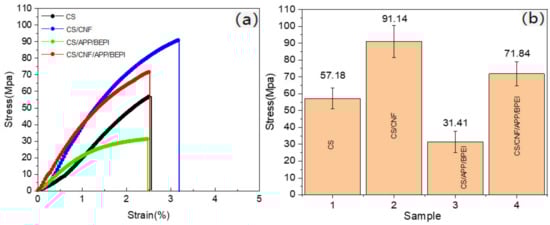 As shown in Figure 8a,b, the pure CS film had good ductility and its tensile strength was 57.18 Mpa because of CS’s long chain molecular structure. They displayed very good film-forming due to the interaction of hydrogen bonding (as described above Figure 1). When APP and BPEI were increased, its ductility became poor and the tensile strength was down to 31.41 Mpa, as APP, as a granular material, was able to block the hydrogen bond links among CS molecular chains [43]. There were no chemical bonds with CS and PEI (as analyzed in Figure 4), which affected the stability of the whole film. Therefore, CNF was used to inhibit the effect of APP on the mechanical properties of CS film. The mechanical strength of the CS/CNF composite film showed a great improvement and reached 91.14 Mpa. This is because CNF is a filamentous material and easily able to form a stable three-dimensional network structure in the CS matrix [38]. Additionally, the abundant -OH on the CNF surface could form strong hydrogen bonds with the active groups of CS. However, the ductility became weak. When CNF was added to the CS/APP/BPEI system, the tensile strength came back to 71.84 Mpa, showing a good inhibitory effect on the negative impact of APP on the mechanical strength of CS-based films.