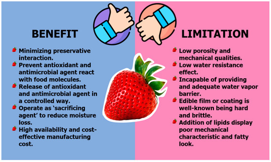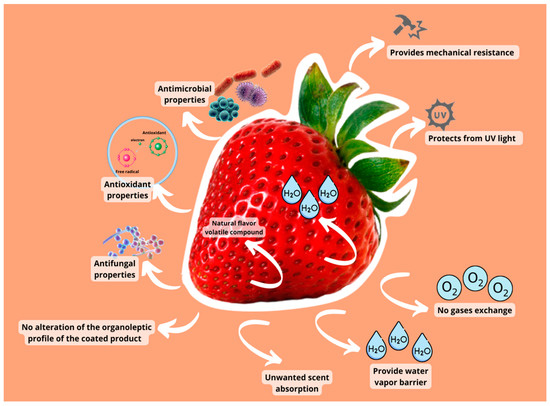 Key quality aspects of edible films or coatings are the protective characteristics against water vapor, gases, and chemical migration; physical and mechanical protection; and influence on product appearance, including color and gloss [81]. Post-harvest quality loss of fresh goods is connected to biochemical and physiological changes in the living tissue caused by mass transfer phenomena, such as moisture and oxygen exchanges, undesirable odor absorption, ethylene production, or flavor loss [82]. Post-harvest losses are related to microbial changes, fungal deterioration, increased risk of food-borne disease, and shorter storability. Antibacterial chemicals in the polymeric matrix are another prominent topic in coating design. Besides, the effectiveness of edible coating relies on the wettability of the product and is impacted by both the surface qualities of fresh food and the chemical composition and structure of coating-forming polymers. Plasticizers, surfactants, antimicrobials, and antioxidants can alter the coating process’ efficacy and affect the film thickness during coating development [83].