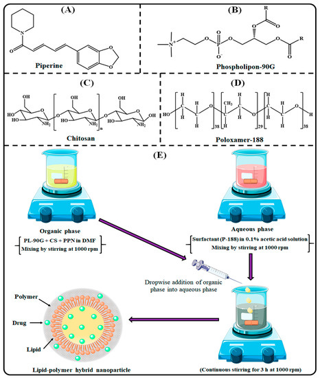 Image illustrating the chemical structure of (A) PPN, (B) PL-90G, (C) CS, (D) P-188, and (E) scheme for the preparation of PPN-LPHNPs.