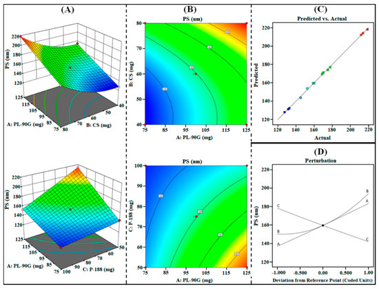 The statistical plots, i.e., 3D surface, contour, perturbation, and predicted vs. actual plots as shown in Figure 2A–D and polynomial Equation (5) suggested that the increase in the concentration of all independent factors from low (“–1”) to medium (“0”) and then to high (“+1”) significantly influence the PS of PPN-LPHNPs. As per the results, PS significantly increases by increasing the amount of PL-90G (coded as “A”) and CS (coded as “B”). An increment in the PL-90G concentration from 75 mg to 125 mg significantly increases the viscosity of organic solution during the preparation and greatly increases the interfacial tension between organic and aqueous phases that led to the coalescence of PL-90G, which produce LPHNPs with high PS [30]. Similarly, an increment in the CS concentration from 40 mg to 80 mg significantly increases the viscosity of the organic phase, which leads to the development of larger aggregates that ultimately produce LPHNPs with high PS [28,37]. Moreover, the PS of PPN-LPHNPs significantly reduces on increasing the amount of P-188 (coded as “C”). An increment in the P-188 concentration from 50 mg to 100 mg significantly reduces the interfacial tension and enhances the emulsification of the organic phase with the aqueous surfactant solution that resulted in the development of small-sized PPN-LPHNPs [38].