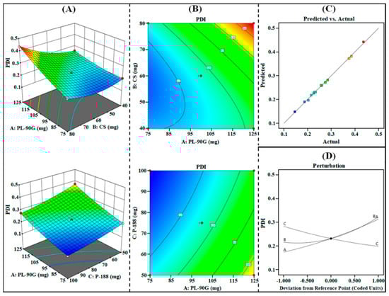 The statistical plots, i.e., 3D surface, contour, perturbation, and predicted vs. actual plots as shown in Figure 3A–D and polynomial Equation (6), suggest that the increase in the concentration of all independent factors from low (“–1”) to medium (“0”) and then to high (“+1”) significantly influence the PDI of PPN-LPHNPs. As per the results, PDI significantly increases by increasing the amount of PL-90G (coded as “A”) and CS (coded as “B”). An increment in the PL-90G concentration from 75 mg to 125 mg significantly increases the viscosity of organic solution during the preparation that significantly increases the heterogeneity among the PPN-LPHNPs, which produce LPHNPs with high PDI [39]. Furthermore, an increment in the CS concentration from 40 mg to 80 mg supports the formation of coarse dispersion during the preparation due to lack of energy to combat the viscous forces and produce PPN-LPHNPs with high PDI [40]. Moreover, the PDI of PPN-LPHNPs significantly reduces on increasing the amount of P-188 (coded as “C”). An increment in the P-188 concentration from 50 mg to 100 mg significantly reduces the interfacial tension and enhances the emulsification of the organic phase with the aqueous surfactant solution, which leads to the development of small-sized PPN-LPHNPs with excellent homogeneity [27].