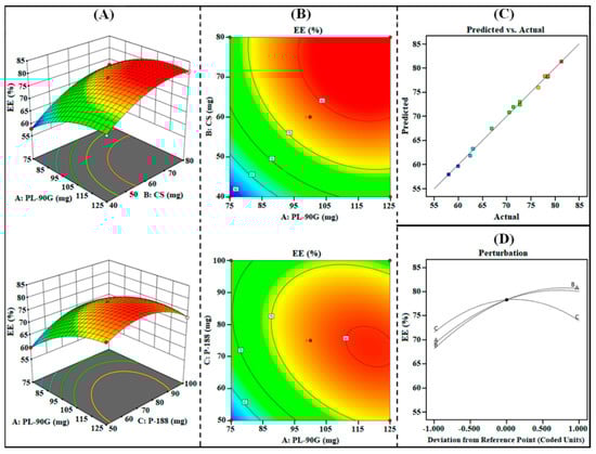 The statistical plots, i.e., 3D surface, contour, perturbation, and predicted vs. actual plots as shown in Figure 4A–D and polynomial Equation (7), suggested that the increase in the concentration of all independent factors from low (“–1”) to medium (“0”) and then to high (“+1”) significantly influences the %EE of PPN-LPHNPs. As per the results, %EE significantly increases by increasing the amount of PL-90G (coded as “A”), CS (coded as “B”) as well as P-188 (coded as “C”). An increment in the PL-90G concentration from 75 mg to 125 mg significantly increases the viscosity of the organic phase, leading to rapid solidification. Rapid solidification of PL-90G significantly restricts the diffusion of PPN from the external phase, which, in turn, produces LPHNPs with high %EE [41]. Furthermore, an increment in the CS concentration from 40 mg to 80 mg significantly increases the space for entrapment of PPN and produces a compact matrix that provides PPN-LPHNPs with a high %EE [42]. In addition, the %EE of PPN-LPHNPs significantly increases on increasing the P-188 concentration from 50 mg to 75 mg. An increment in the P-188 concentration provides higher emulsification of lipid phase with surfactant solution and produces PPN-LPHNPs with high %EE. However, increment in P-188 concentration from 75 mg to 100 mg resulted in the reduction in the PS of PPN-LPHNPs. The reduction in the %EE on increasing the surfactant concentration after a certain limit ascribed to the enhancement in the partitioning of PPN from the internal to external phase results in the development of PPN-LPHNPs with low %EE [43].