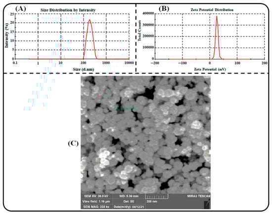 For ideal oral delivery, the size of nanoparticles should be small to attain the maximum surface for higher intestinal absorption and thereby oral bioavailability. In our investigation, the optimized PPN-LPHNPs exhibited an average PS of 151.2 ± 4.12 nm, as represented in Figure 5A. The PDI plays a significant role in the development of excellent nanoparticles for effective delivery. The PDI should be low because it indicates the uniformity among the nanoparticles in a system. The PDI value <0.3 for polymeric nanocarrier represents good homogeneity [44]. In our investigation, the optimized PPN-LPHNPs exhibited an average PDI of 0.213 ± 0.02. ZP plays a significant role in the colloidal stability of LPHNPs. A high ZP vale (>20 mV) is considered as an ideal surface charge for colloidal nanoparticles because a high surface charge repels each other, and the chance of aggregation becomes negligible and shows excellent colloidal stability [45]. In our investigation, the optimized PPN-LPHNPs exhibited an average ZP of +24.31 ± 2.41 mV, as depicted in Figure 5B. A positive value of ZP was observed due to the presence of CS in the outer shell and on the surface of PPN-LPHNPs. A positive ZP is advantageous for the oral delivery of phytochemicals because it adheres to the negatively charged mucosa of the intestinal membrane, produces significantly greater residence time in the GIT, and improves the intestinal absorption and thereby bioavailability of phytochemicals [46]. An SEM micrograph of the PPN-LPHNPs is depicted in Figure 5C. The shape of the optimized PPN-LPHNPs was spherical and uniformly distributed as well as separated from each other.